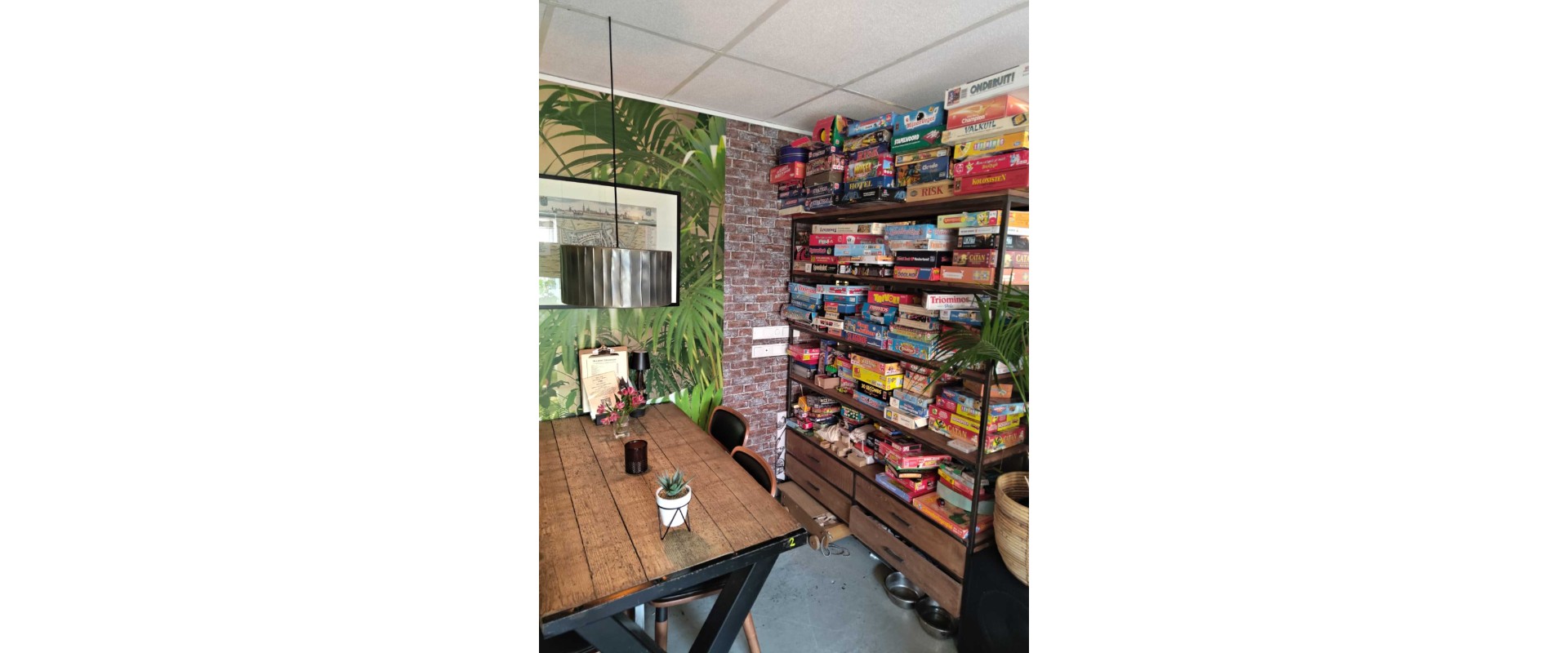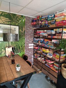 Met op de tafels kletspotten en spelletjes. Ook elke vrijdag avond staan de spelletjes klaar.