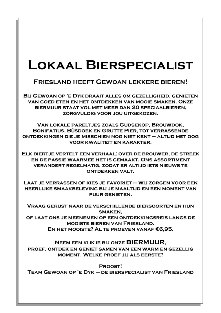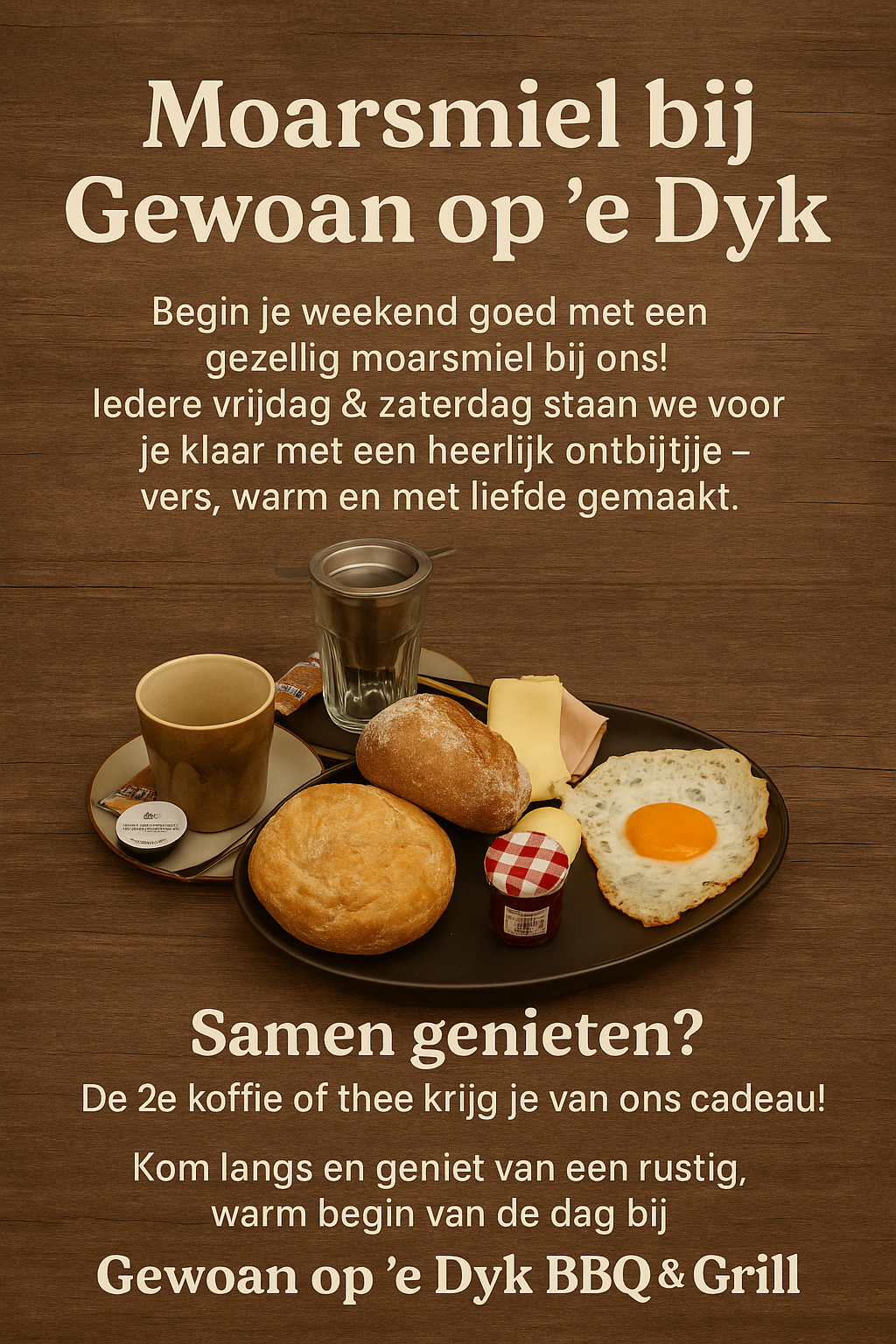 Welkom bij Gewoan op ‘e Dyk BBQ & Grill! Wat leuk dat je ons hebt gevonden. Bij ons draait het om goed eten, gezelligheid en het gevoel van thuiskomen. Geniet van onze gerechten van de BBQ & Grill — met liefde bereid, vol smaak en zonder poespas. Neem plaats, ontspan en geniet van het prachtige uitzicht over de historische binnenstad van Dokkum. Gewoan lekker, gewoan samen.